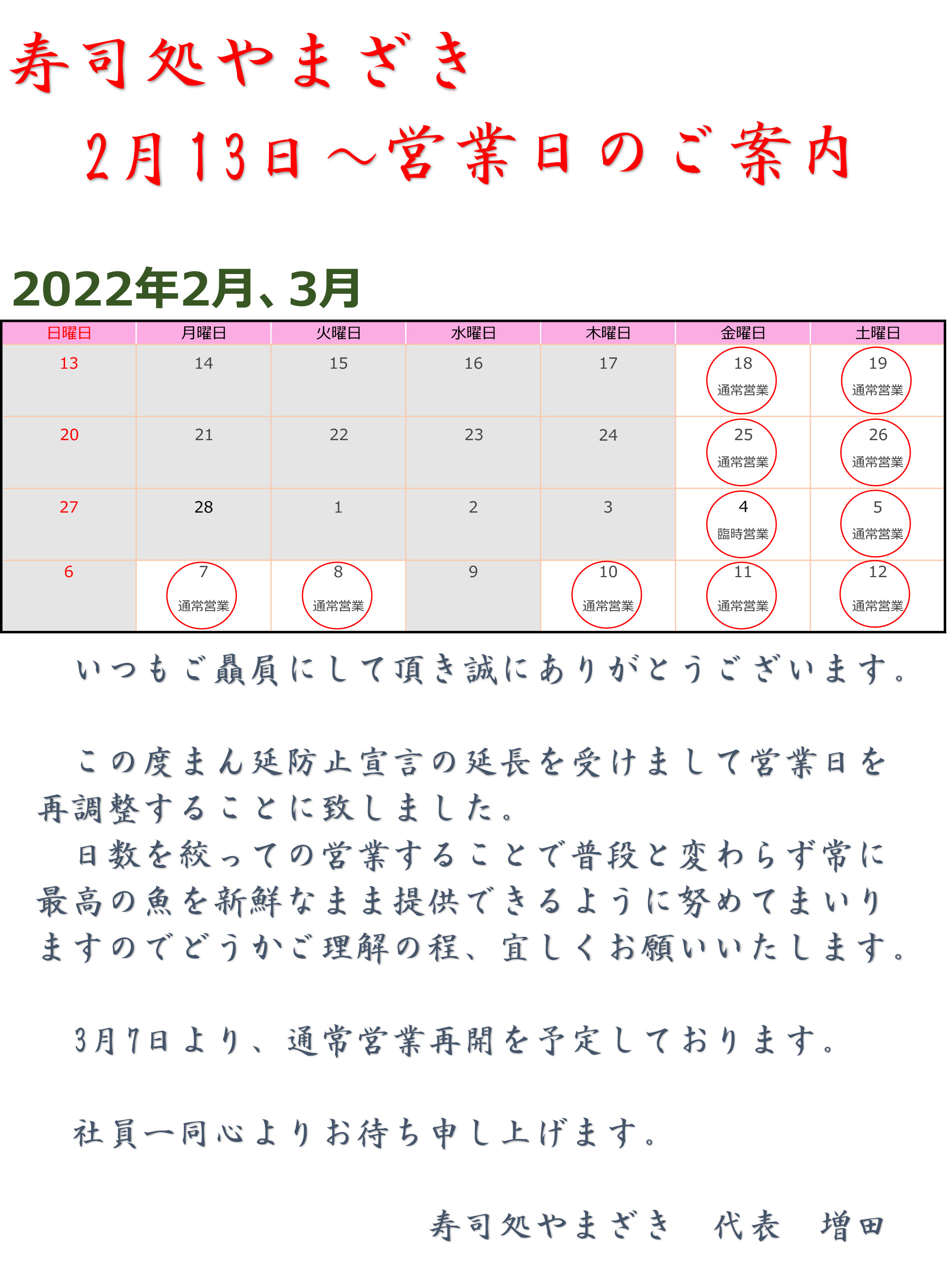 • 2022年2月14日~まん延防止発令延長による営業日のお知らせ